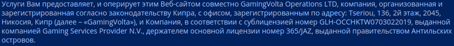 Компания является держателем игровой лицензии и отвечает за обработку платежей через Skrill и/или NETELLER, в то время как GamingVolta обрабатывает все другие типы платежей в соответствии с соглашением между Компанией и GamingVolta.